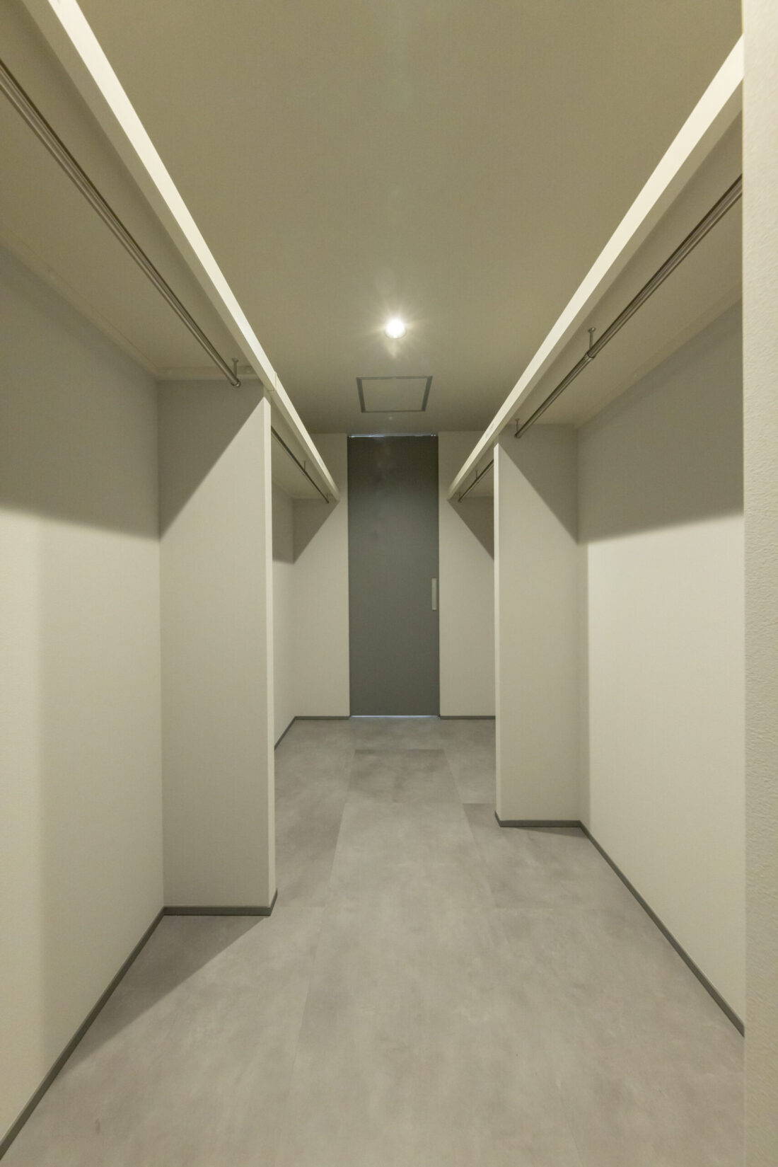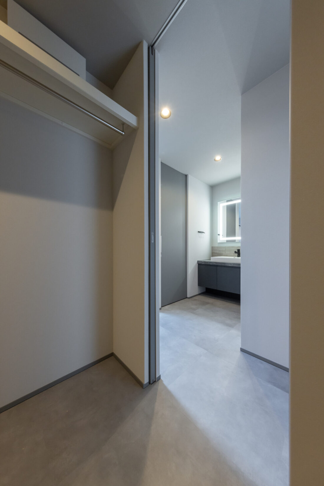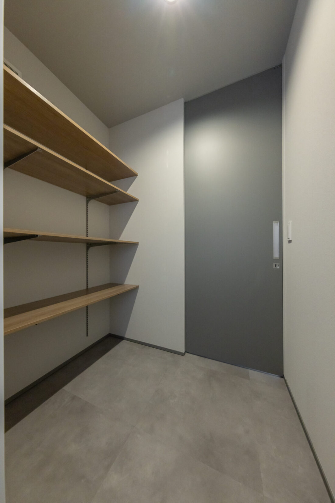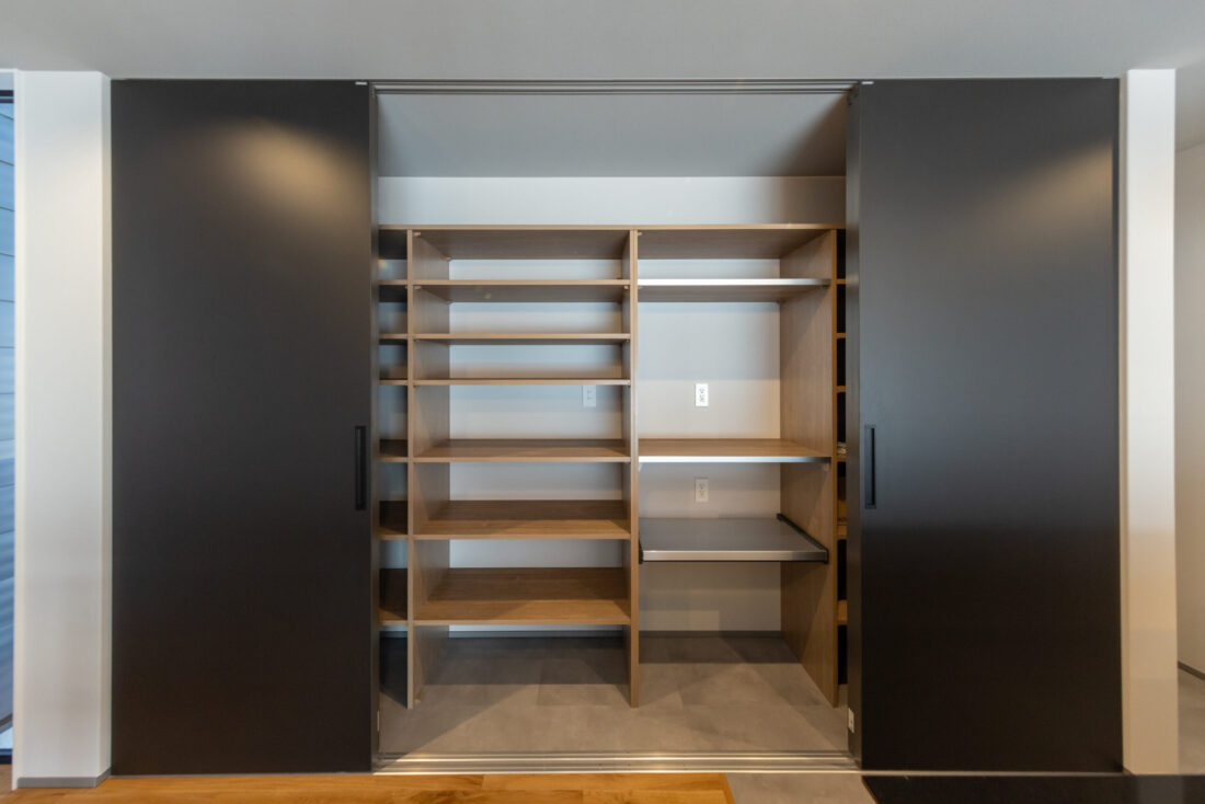 キッチンのすぐそばに設けたファミリークロークは、家族みんなの衣類や日用品をまとめて収納できる便利な空間。